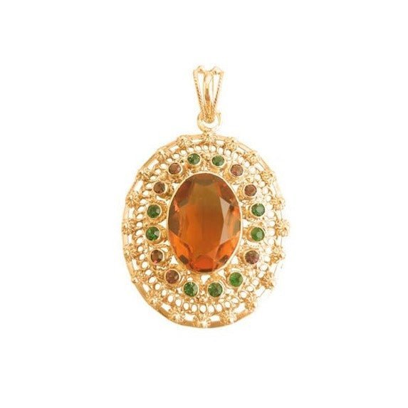 Medallón de Oro de 19,2K con Citrino Ovalado Flanqueado por Piedras Sintéticas de Colores, Adornado con Caracoles.