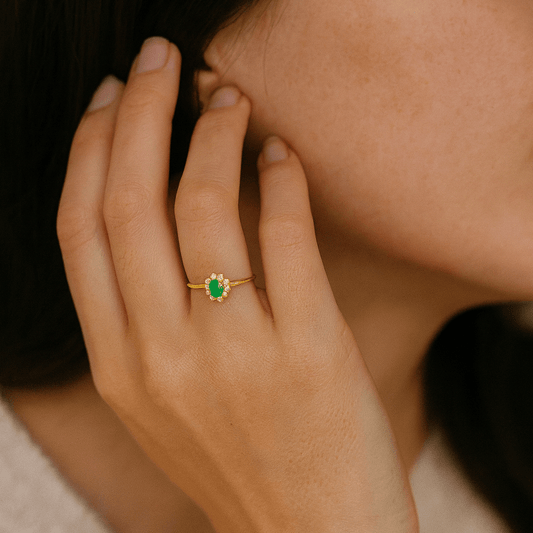 Anel Chuveiro em Ouro 19kl com Pedra Verde e Zirconias (T17)