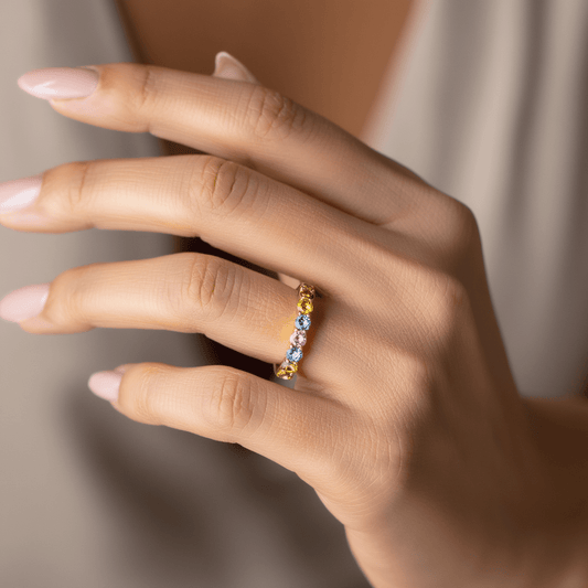 Anel Meia Memória em Ouro 19kl com Topázios Coloridos (T15)