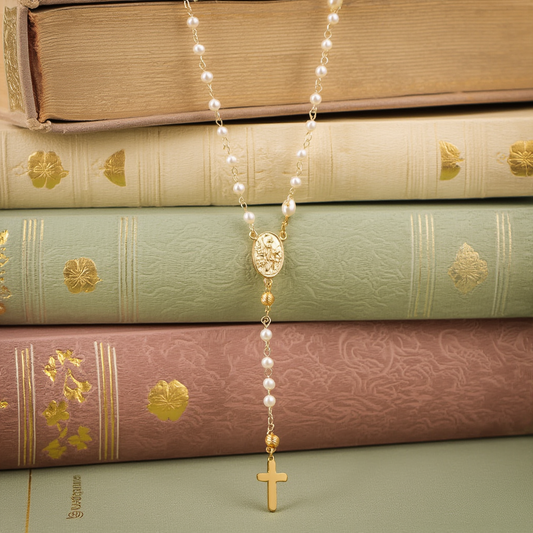 Fio Terço Nossa Senhora das Graças e Pérolas em Prata Dourada (48.5cm)