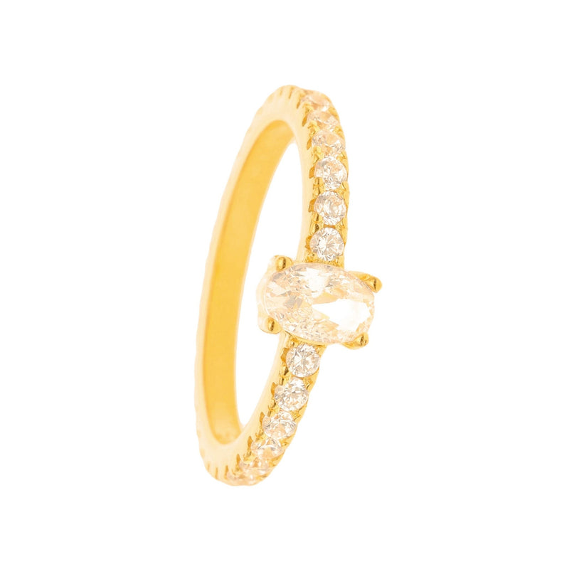 Anel em Prata Dourada com Zircónia Oval Central e Aro Cravejado de Zircónias – Elegância que Brilha em Todos os Ângulos