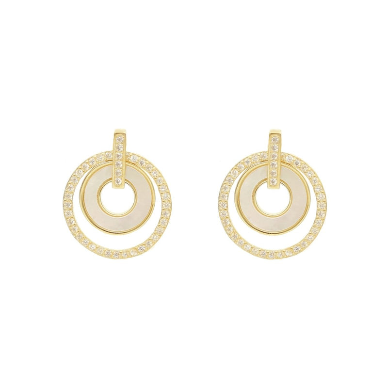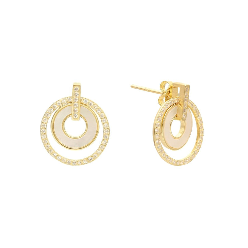 Brincos Circulo Duplo em Prata 925 Dourada cravejados de zircónias e centro em Madrepérola