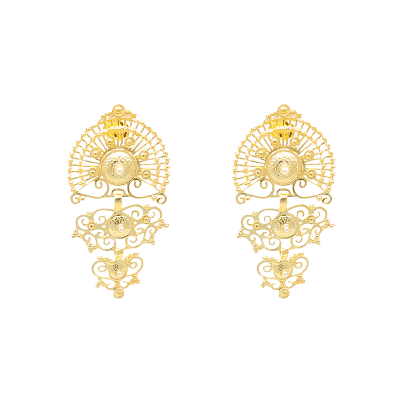 Os Brincos Luminis em Prata Dourada 925 são uma uma celebração ao esplendor e à exclusividade da joalharia portuguesa. Os brincos apresentam um tom rico de dourado e pérolas no tom Branco que conferem intemporalidade à peça. Cada brinco é um tributo ao luxo, elaborado meticulosamente por artesãos em Portugal, com detalhes que captam a essência da sofisticação. O design ousado dos Brincos Luminis transmitem confiança e prometem audácia e atrevimento.