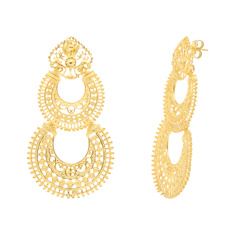 Os Brincos Solaris em Prata Dourada 925 são uma uma celebração à exclusividade e ao estilo de joalharia caraterística de Portugal. Os brincos apresentam um tom rico de dourado e um trabalhado meticuloso que confere distinção à peça. Cada brinco é um tributo ao luxo, elaborado meticulosamente por artesãos em Portugal, com detalhes que captam a essência da sofisticação. O design dos Brincos Solaris adapta-se a ocasiões especiais e festivas, pelo seu tamanho distinto.