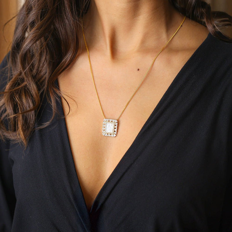 Mais do que um acessório, este escapulário em prata é um símbolo de devoção e proteção divina. As imagens religiosas esculpidas em madrepérola refletem a luz da fé e da espiritualidade, enquanto os detalhes em zircónias, dispostos em forma de coração, representam o amor incondicional e a presença constante do sagrado no dia a dia.