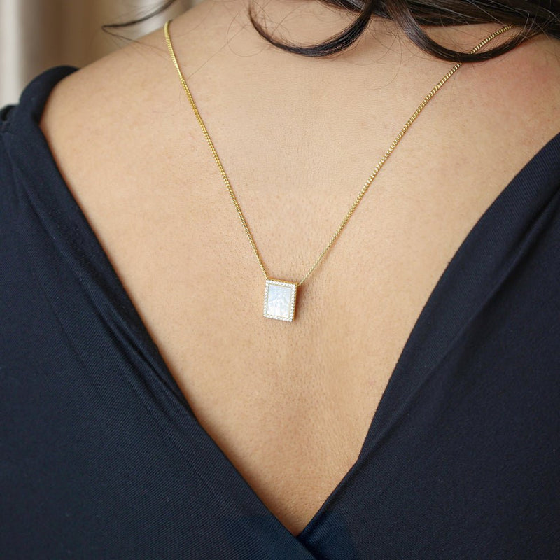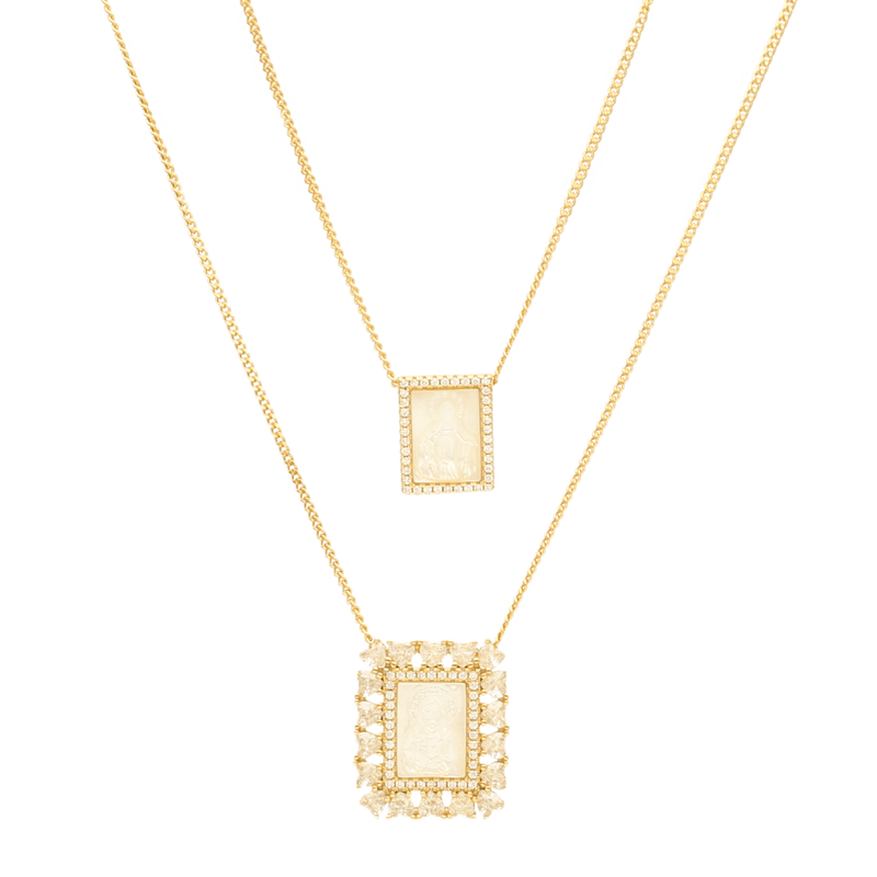 Escapulário em Prata Dourada com Imagem Religiosa em Madrepérola com Zircónias em Coração