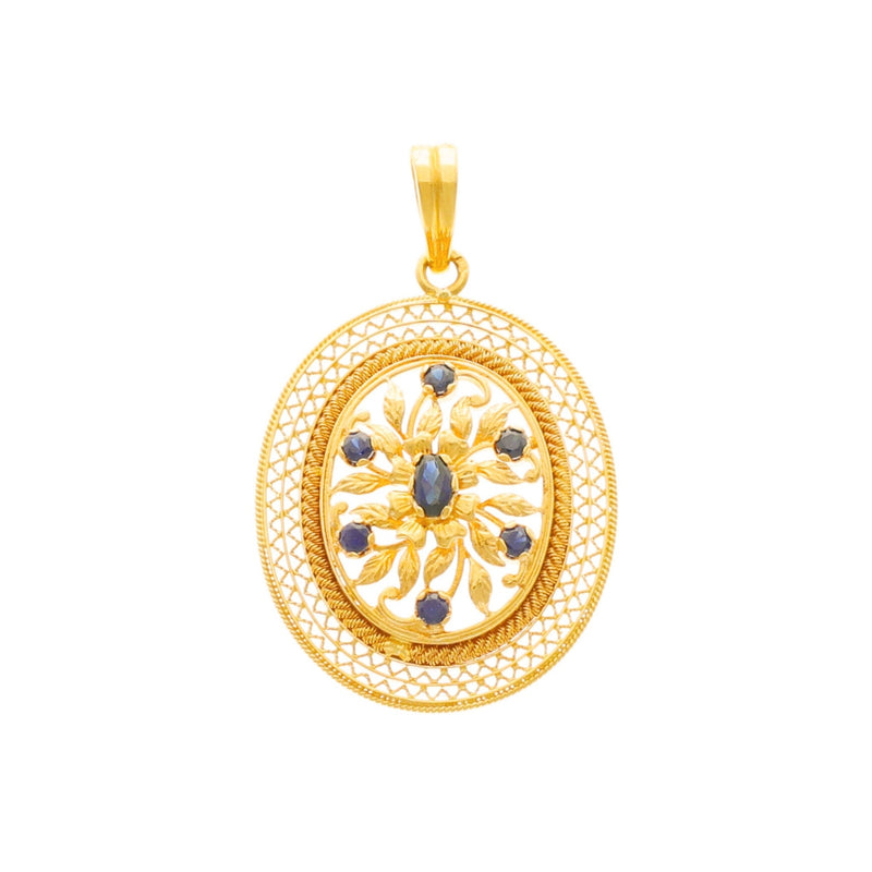Medalha Oval em Ouro de 19kl com Motivos Florais e Topazios Azuis