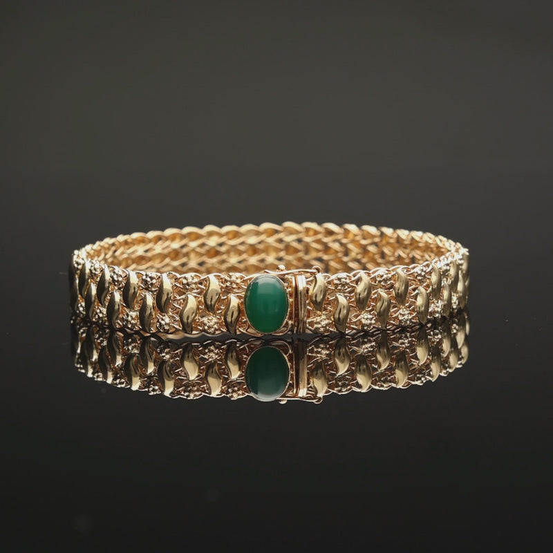 Pulseira Baronesa em Ouro de 19,2Kl com Pedra Verde e bracelete toda adornada de elegantes caramujos