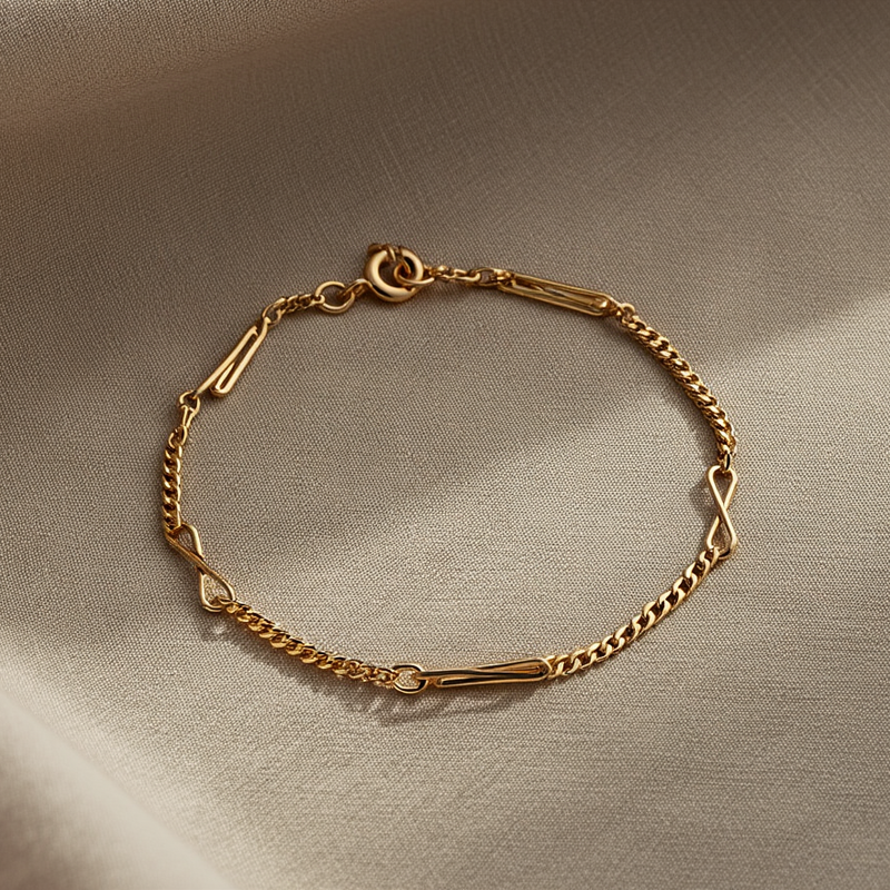 A Pulseira de Ouro 19kl com Elos Infinito e Traves Entrelançadas é uma joia de linhas elegantes e simbolismo profundo. O seu design combina os clássicos elos infinito, que representam ligação eterna e continuidade, com traves únicas — formadas por dois elos ovais, colocados um dentro do outro com precisão e harmonia. Este entrelaçado subtil cria um efeito visual sofisticado e moderno, que confere ritmo e fluidez à peça.