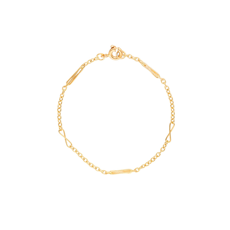 Ideal para quem procura uma pulseira com significado e detalhe, esta pulseira com elos infinito e traves entrelaçadas é perfeita para o uso diário ou para completar um look mais cuidado. O ouro de 19 quilates brilha com intensidade discreta, enquanto o design estruturado oferece conforto e presença. Uma joia pensada para mulheres que valorizam estilo, simbolismo e a beleza dos pequenos detalhes.