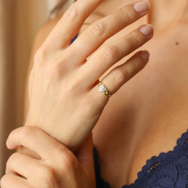 Este anel delicado, pensado especialmente para criança, combina ternura e brilho num design encantador. O aro em ouro apresenta um elegante efeito de corrente, simbolizando ligação e proteção, enquanto o destaque vai para o coração central, finamente cravejado de diamantes que captam a luz com um brilho suave e encantador.