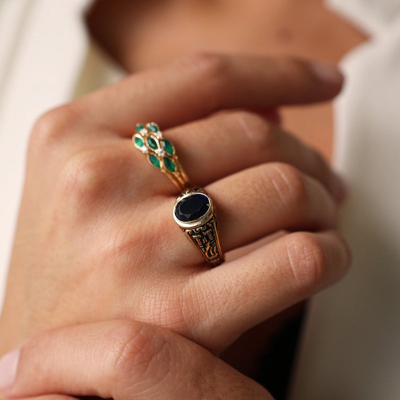Anel de Curso em Ouro de 19.2kl com Safira Australiana, e aro adornado de motivos náuticos, com acabamento em esmalte preto