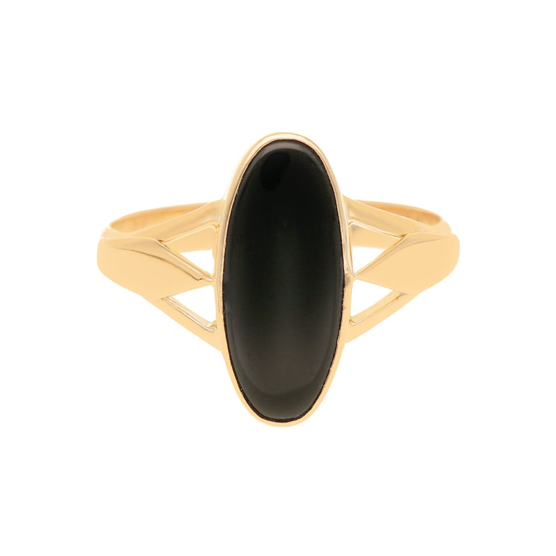 O Anel Oval em Ouro de 19.2kl adornado de Pedra Ónix é uma peça que une a nobreza do ouro com a elegância intemporal da pedra preta.