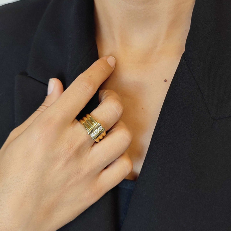 Este requintado anel é uma expressão de elegância atemporal e sofisticação. Confeccionado em ouro amarelo de 19,2kl, destaca-se pela presença de três deslumbrantes diamantes, que são verdadeiras obras-primas da natureza.
