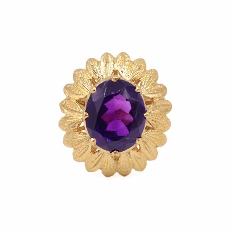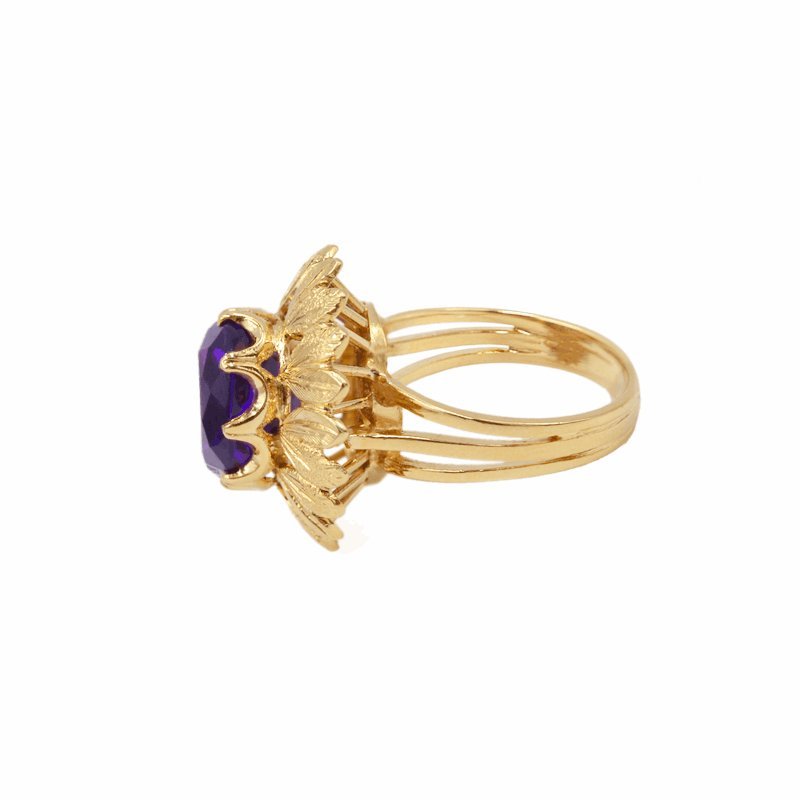 O Anel em Ouro de 19,2kl adornado de Pedra Roxa ladeada de elegantes Pétalas é uma peça que une a beleza do ouro de alta qualidade com a sofisticação da pedra lilás. A pedra lilás, muitas vezes associada à espiritualidade e à intuição, é a peça central deste anel, trazendo um toque de cor e significado à joia.