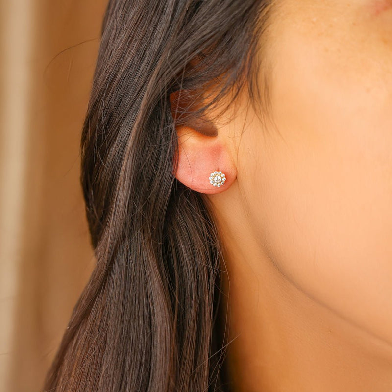 Delicadeza e brilho definem estes mini brincos em ouro 19kl com zircónias, perfeitos para um toque discreto de elegância. Com design circular, as zircónias estão dispostas de forma harmoniosa, lembrando uma flor — uma pedra central rodeada por zircónias que formam as pétalas.