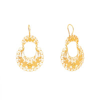 Estes deslumbrantes brincos de filigrana são um testemunho da ourivesaria tradicional, apresentando um design leve e arejado, caracterizado pelos seus espaços em aberto cuidadosamente integrados. O trabalho de filigrana artesanal cria padrões geométricos ou florais intrincados, utilizando finíssimos fios de metal em prata dourada que se entrelaçam, mas deixam propositadamente áreas vazias. Esta técnica confere aos brincos uma leveza visual e física, contrastando a riqueza do detalhe com a transparência do espaço.