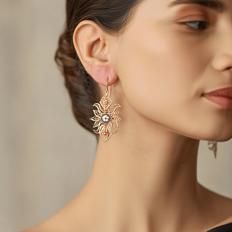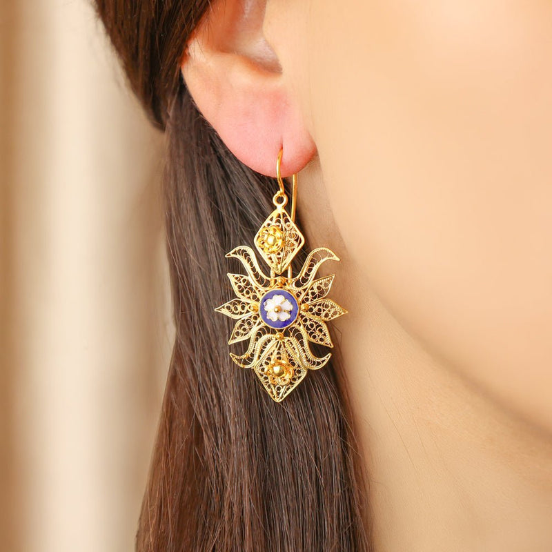 O destaque desses brincos reside nos detalhes intrincados, especialmente no centro, onde motivos florais em esmalte azul e branco evocam a rica tradição dos azulejos portugueses.
