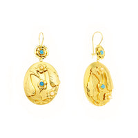 Delicados, românticos e profundamente tradicionais, os Brincos Maria destacam-se pelo seu design cheio de detalhe e simbolismo. No topo, uma flor de múltiplas pétalas abraça uma pérola turquesa, criando um contraste de cor encantador. Abaixo, um círculo ricamente trabalhado com motivos florais em alto-relevo dá vida ao restante brinco. No centro de cada flor, encontra-se uma pérola branca ou uma turquesa, criando um jogo de luz e cor que torna a peça vibrante, harmoniosa e cheia de personalidade.