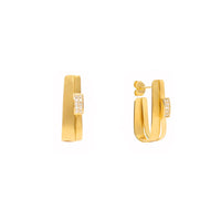 Os Brincos Nefertiti em prata dourada distinguem-se pelo seu design geométrico e contemporâneo, marcado por linhas elegantes e um equilíbrio sofisticado entre acabamentos fosco e polido. O detalhe central em formato retangular, cravejado com zircónias, acrescenta um brilho subtil e refinado, captando a luz de forma delicada e elevando a peça a um patamar de luxo discreto.