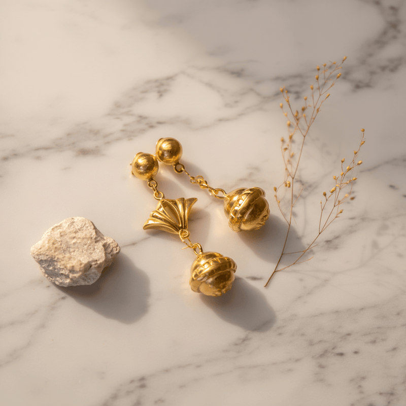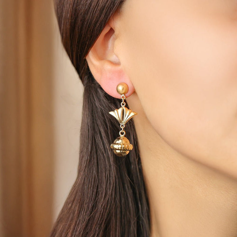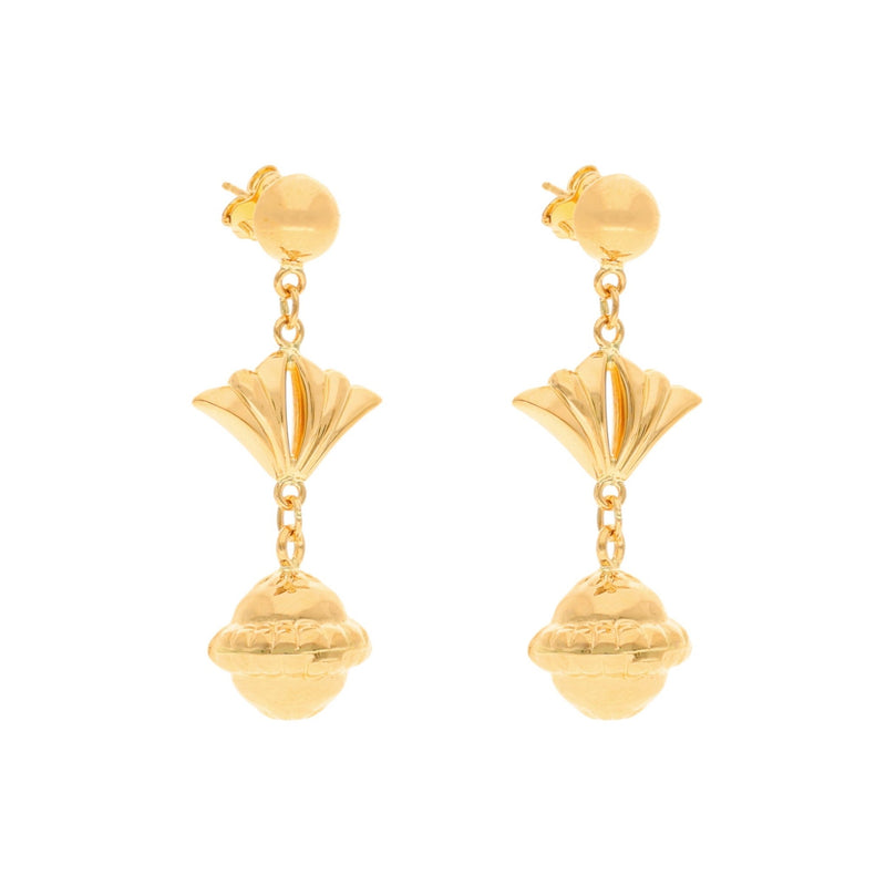 Brincos Pendentes em Ouro com Bola e Detalhe em Leque – Sofisticação e Design Exclusivo