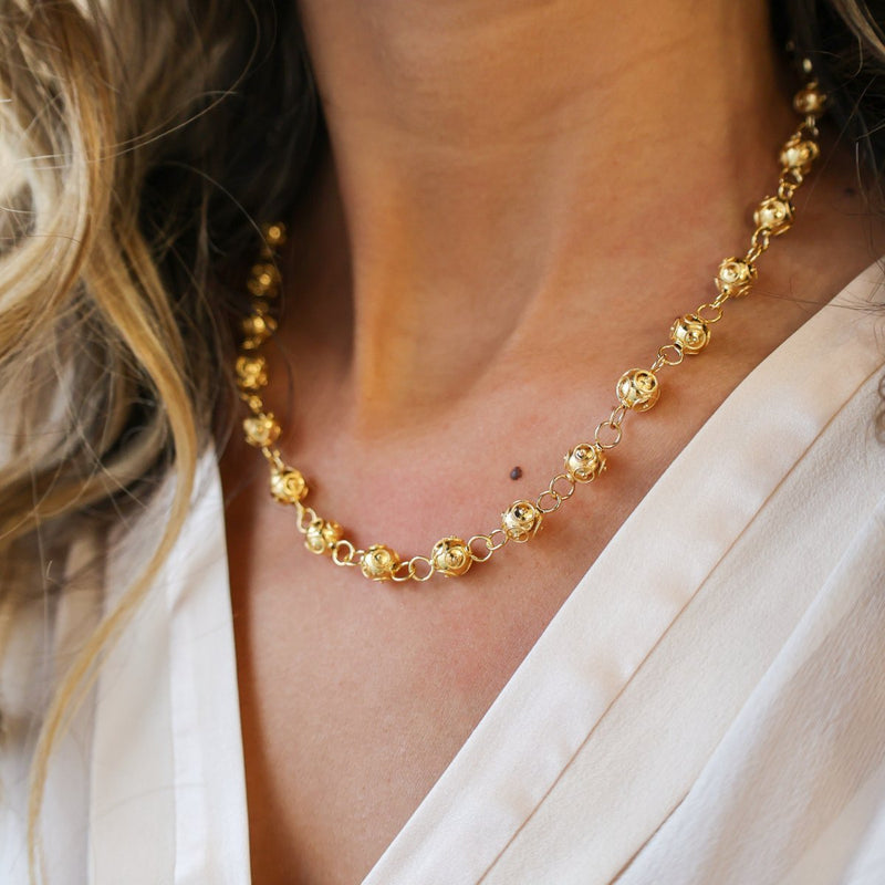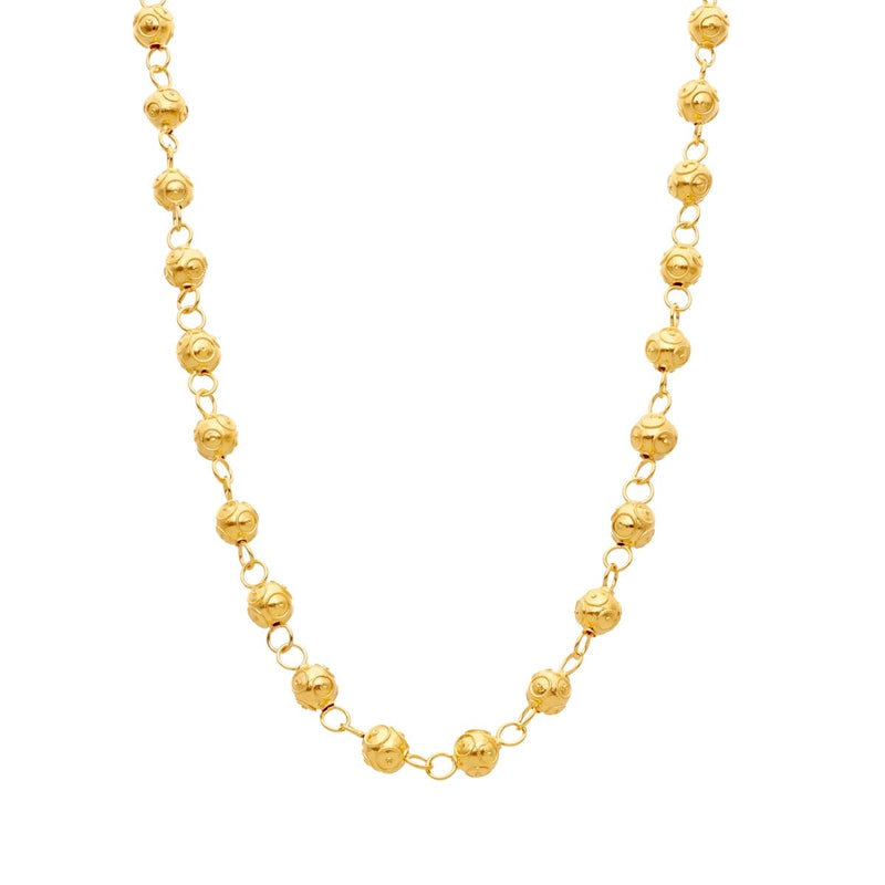 As Contas de Viana são elementos icónicos da joalheria portuguesa, conhecidas por sua simbologia e apelo estético. Este colar apresenta essas contas em ouro de 19.2kl, proporcionando um brilho excecional e uma qualidade duradoura.