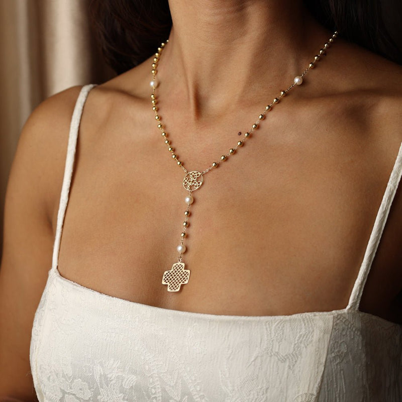 Este colar em ouro 19 quilates é uma peça sublime que une a delicadeza das pérolas, a simbologia da cruz e o brilho das esferas douradas num design equilibrado e sofisticado. As pérolas e a cruz pendem com leveza, conferindo movimento e um toque espiritual à peça, enquanto as esferas ao longo do fio trazem textura e luminosidade.