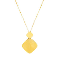 Este elegante fio apresenta um pendente que é uma celebração geométrica em prata dourada. A peça é composta por dois losangos distintos que caem em cascata, criando um efeito visual dinâmico. O losango superior, pequeno e polido, capta a luz com um brilho espelhado e intenso, servindo de ponto de ancoragem. Embaixo, o losango maior é trabalhado com um sofisticado efeito fosco brilhante, que confere profundidade e um toque moderno.