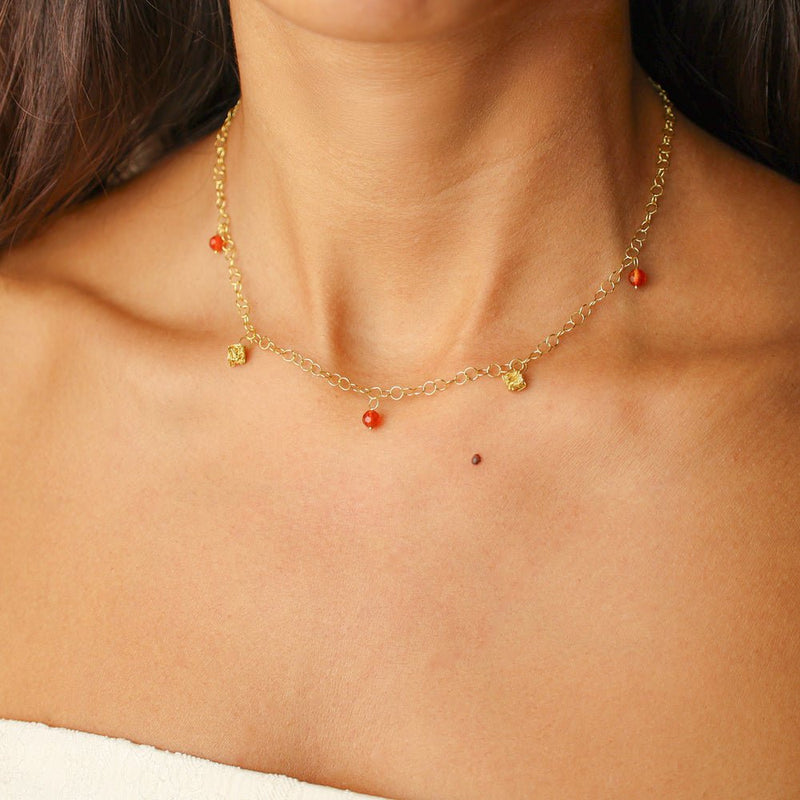 As contas laranja facetadas adicionam vivacidade e frescura à peça, criando um contraste harmonioso com o brilho quente do ouro. Ideal para usar sozinho ou em combinação com outros colares delicados, este fio com berloques dourados é versátil, intemporal e perfeito para dar um toque de cor elegante aos seus looks diários ou de ocasião.