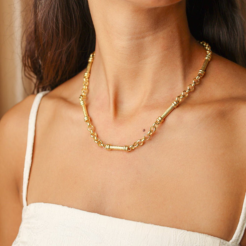 Fabricado em ouro de alta qualidade, este fio é perfeito tanto para uso diário quanto para ocasiões especiais, oferecendo durabilidade e brilho duradouro. Os elos portugueses, conhecidos pelo seu entrelaçamento elegante, evocam a arte da ourivesaria tradicional, enquanto as traves adicionam um toque moderno e geométrico, equilibrando o clássico com o contemporâneo. Uma joia com personalidade, ideal para completar qualquer look com distinção.