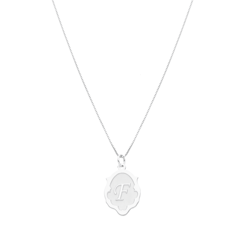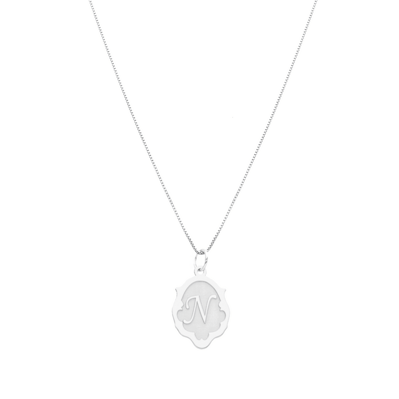Fio em Prata Branca 925 com Malha Veneziana e Pendente Oval Estilizado com Inicial – Elegância e Personalização com Estilo Vintage; Disponível em todas as letras