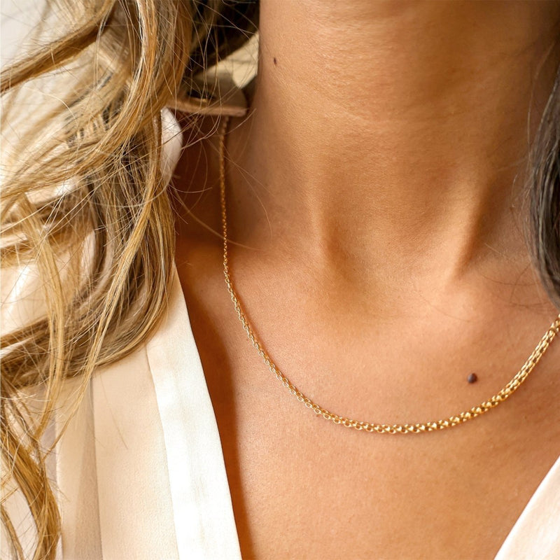 Com um comprimento de 49 centímetros, esta joia é uma escolha versátil que pode ser usada por mulheres e crianças. A malha batida proporciona um equilíbrio entre elegância e simplicidade, tornando-o adequado para uso diário ou para ocasiões especiais.