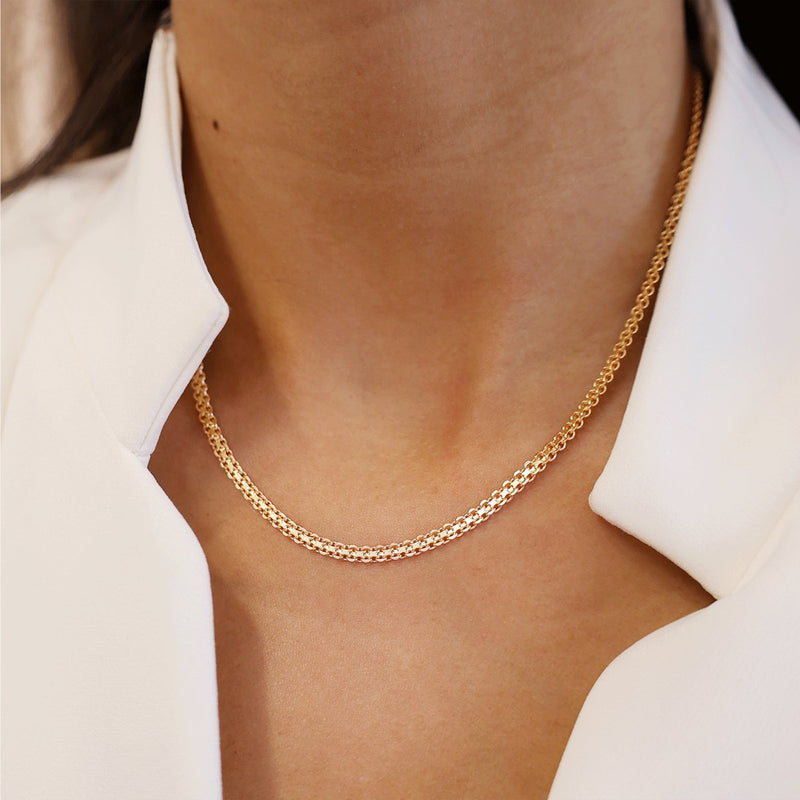 Em ouro de lei de 19,2kl, este Fio de ouro com Malha Batida é perfeito para quem procura uma joia elegante e versátil. A sua beleza está na sua essência minimalista e intemporal que o torna o complemento perfeito para o uso diário ou para um visual mais formal.