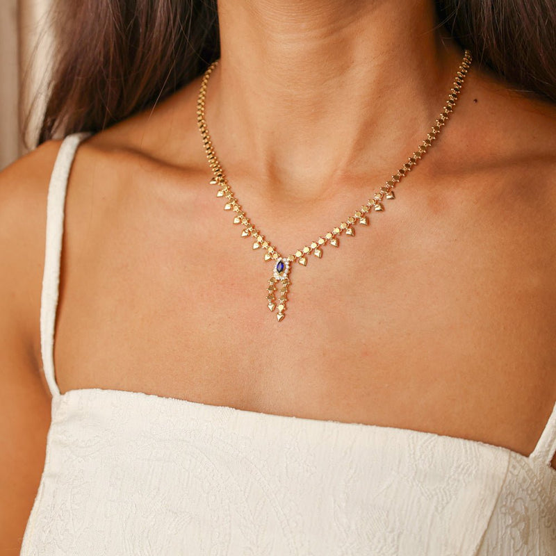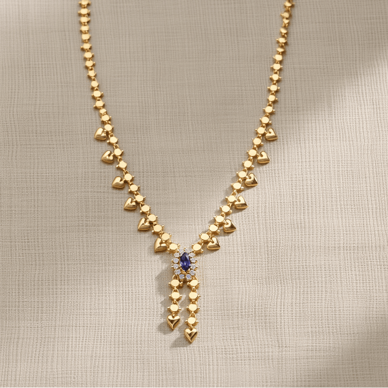 Gargantilha de Ouro 19.2kl com Safira, Zircónias e Corações– Sofisticação Clássica com Design Amoroso