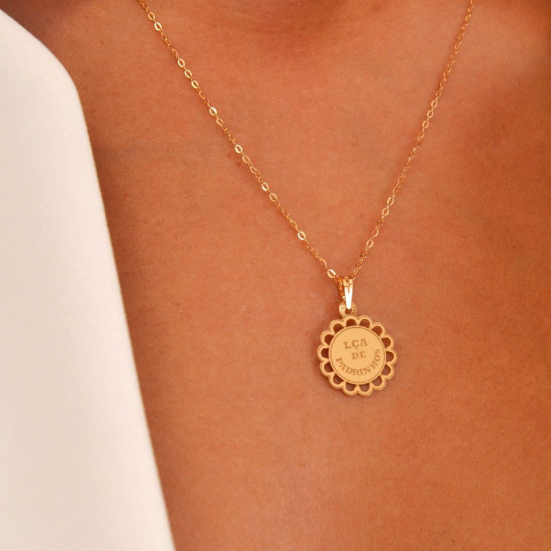 A Medalha em formato de Flor é uma escolha delicada e significativa, simbolizando pureza e beleza. A gravação personalizada "Lça de Padrinhos" adiciona um toque especial, tornando esta medalha um presente memorável.
