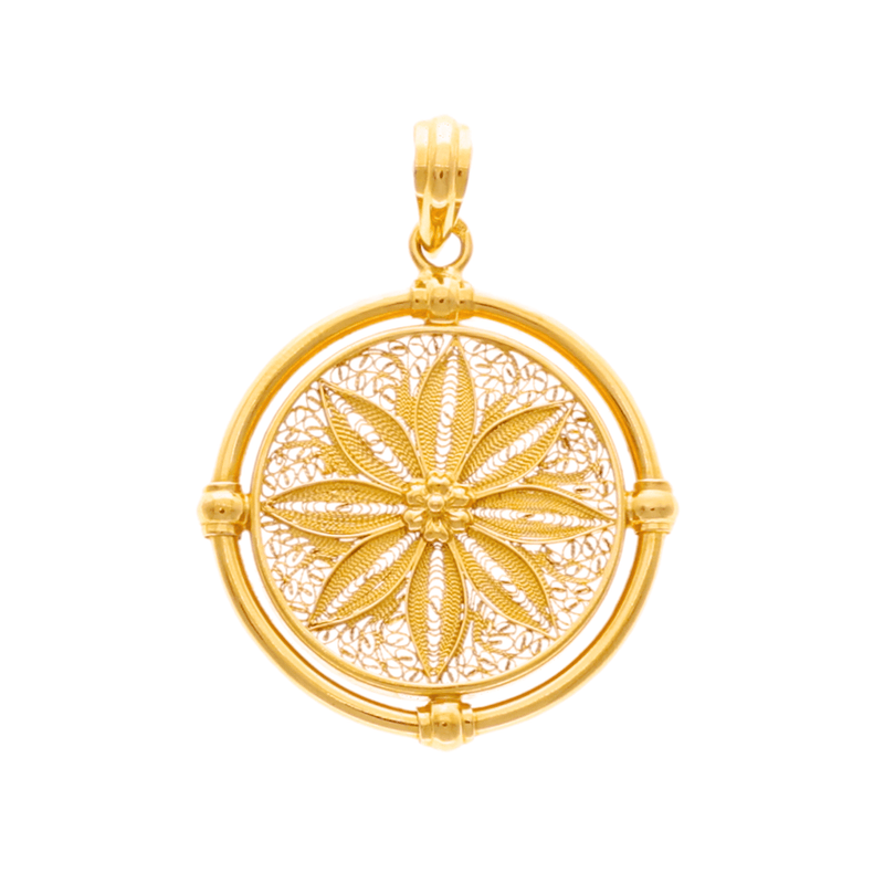 Medalha Redonda em Filigrana de Ouro 19kl com Flor ao Centro
