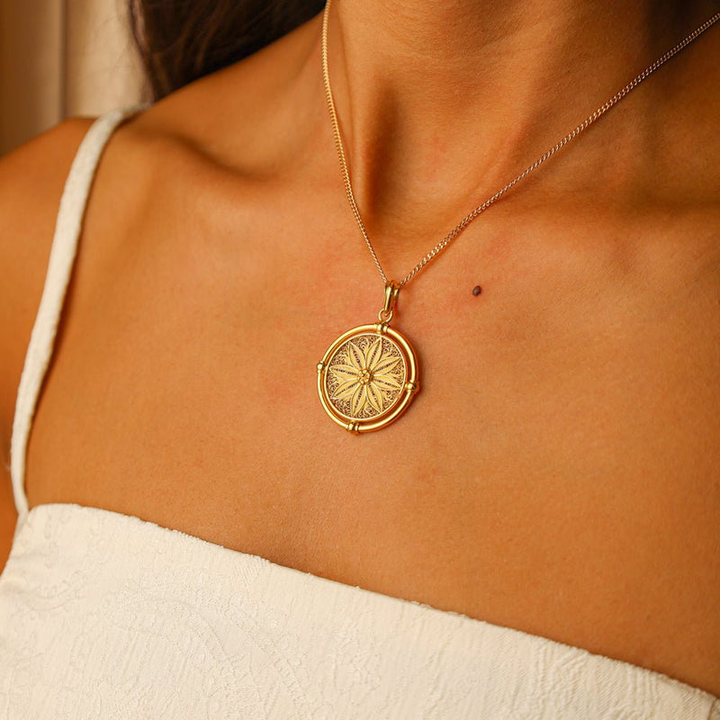 Esta medalha em filigrana com flor no centro é uma verdadeira obra de arte em miniatura, onde a tradição e o detalhe se encontram num design delicado e cheio de simbolismo. Trabalhada em ouro de filigrana português, exibe uma estrutura rendilhada com formas orgânicas e suaves, culminando numa flor central que transmite pureza, feminilidade e renovação.