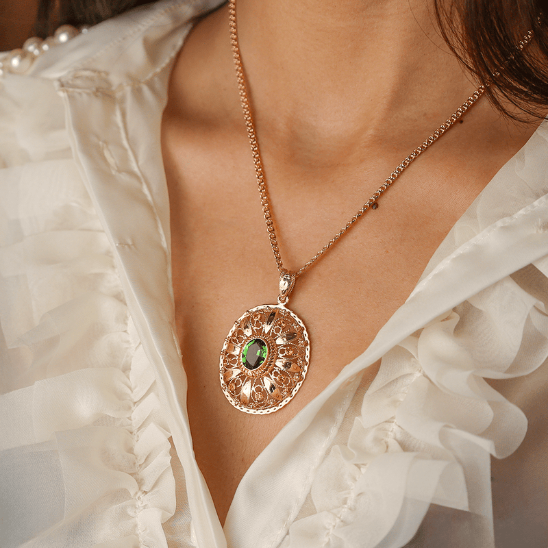 O detalhado trabalho em filigrana adiciona uma dimensão de textura e elegância à medalha, criando um visual verdadeiramente único. As elegantes pedras verdes, com as suas tonalidades vibrantes e brilho intenso, complementam a peça de maneira magnífica.