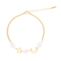 Pulseira em Aço Inoxidável com Estrela, Lua e Pérolas – Brilho Celestial e Elegância Intemporal