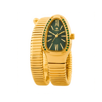 O Relógio Elthora é mais do que um relógio — é uma joia de ousadia e elegância. Com um design inspirado na forma de uma serpente, este modelo envolve o pulso com a graça e a força de um símbolo ancestral de poder e renascimento. A bracelete, trabalhada em aço dourado, imita com perfeição o corpo escamado da cobra, criando um efeito visual hipnotizante e sofisticado que transforma o tempo num detalhe de puro luxo.