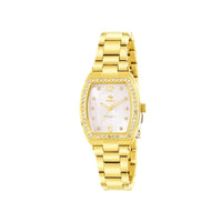 O seu visor retangular de 29,5 x 35mm, rodeado por zircónias cintilantes, adiciona um toque de glamour e elegância ao visual. O relógio todo em aço inoxidável dourado garante durabilidade e resistência, oferecendo um acabamento impecável e confortável no pulso.